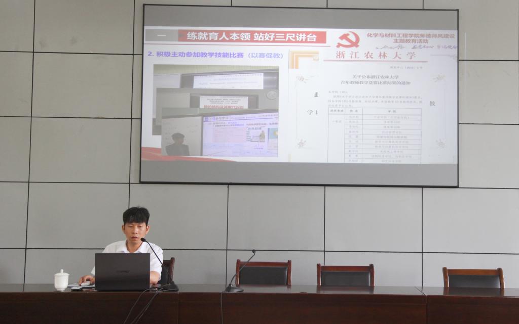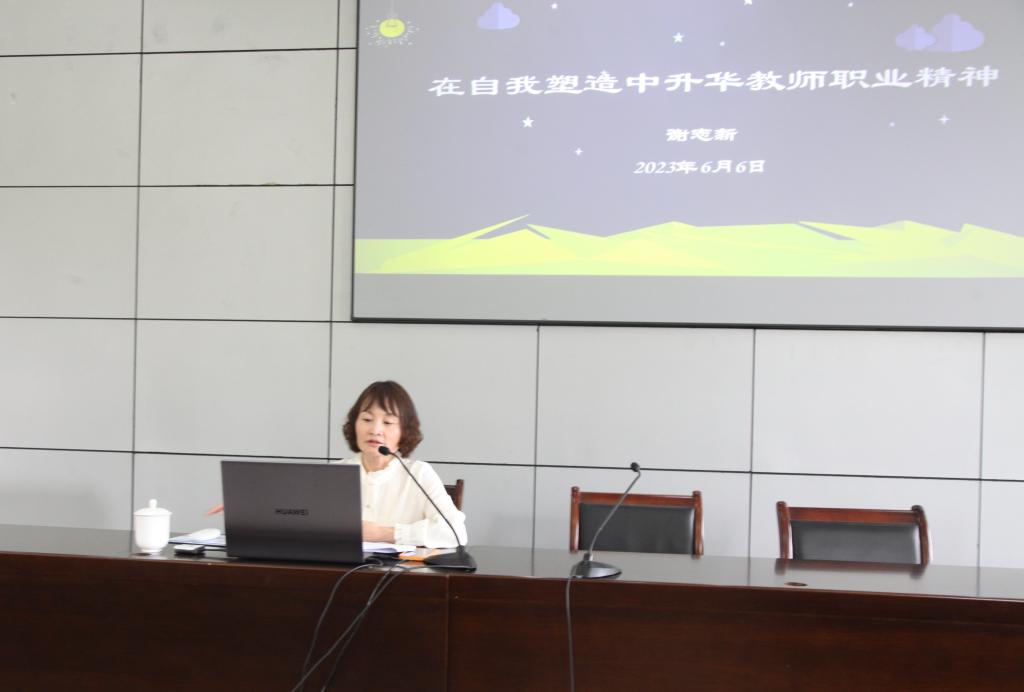 谢志新以《在自我塑造中升华教师职业精神》为主题上了一节微党课。她解读了教师职业行为规范及失范典型案例。她指出,教师要从行为规范上升到自我完善与塑造,努力达到自我实现之境,不断提升职业精神。她强调,师德师风建设是教师终身课题,教师们要守住“底线”,不碰“红线”。各支部以开展学习贯彻习近平新时代中国特色社会主义思想主题教育为契机,带领全体教师学深悟透习近平总书记关于师德师风重要论述,提高政治站位和思想觉悟,努力营造教书育人良好生态。